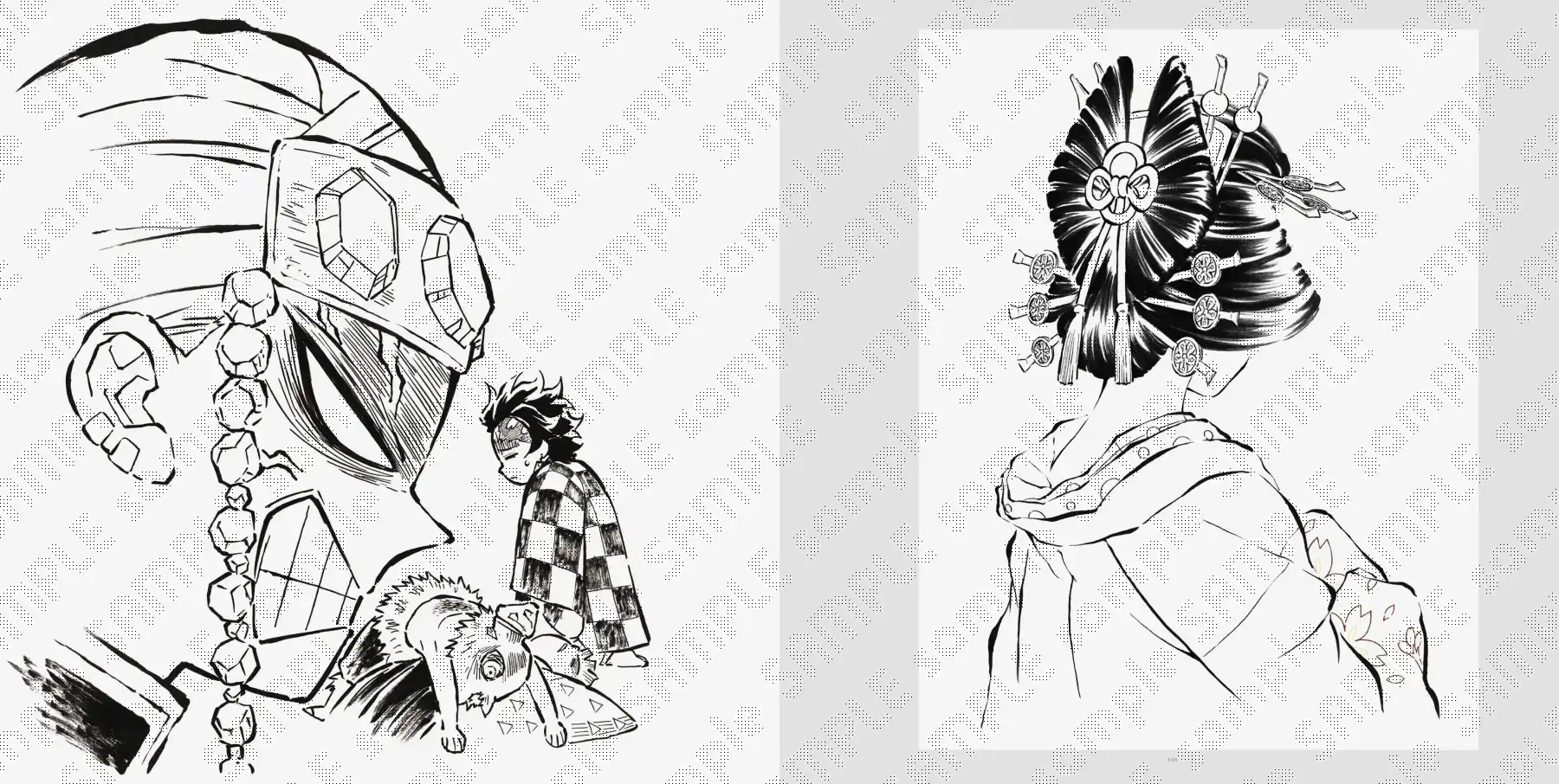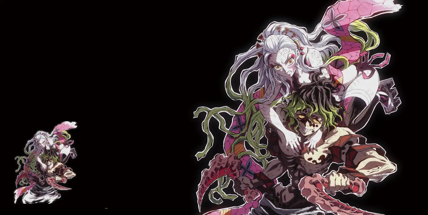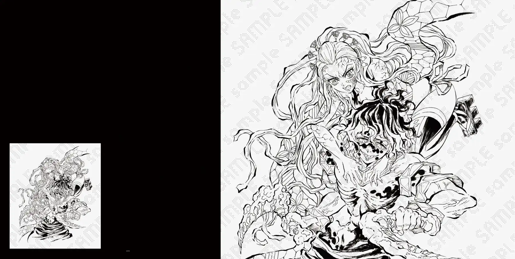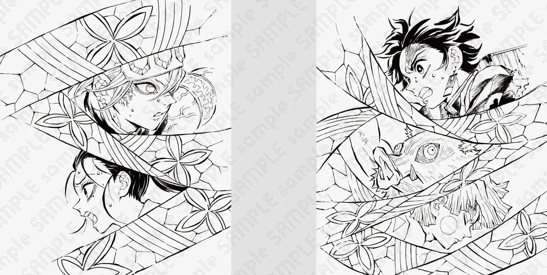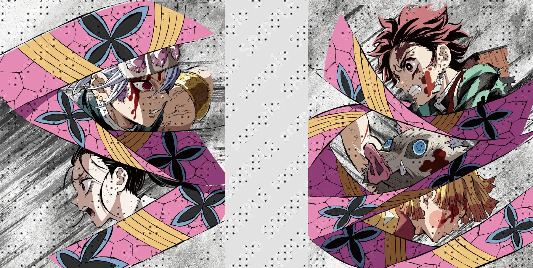 テレビアニメ「鬼滅の刃」遊郭編 第七話~第十話での竈門炭治郎&宇髄天元と妓夫太郎とのバトルアクションシーンを原画集に。