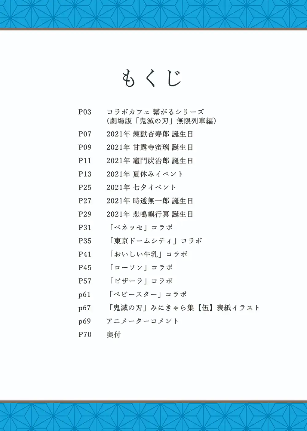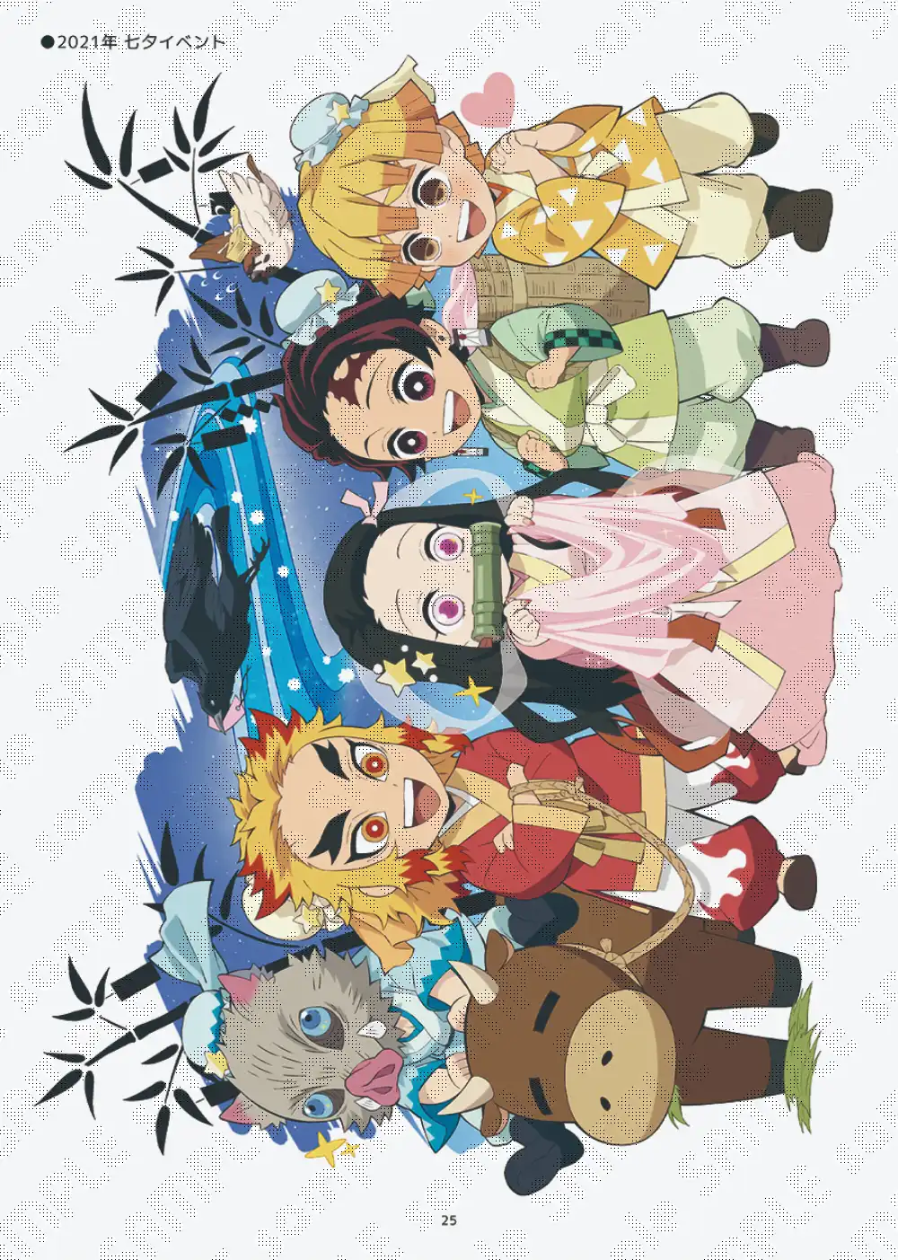 「鬼滅の刃」より、季節をテーマにしたイラストや、誕生日を祝う1枚のイラストをカラーと線画合わせて収録しています。